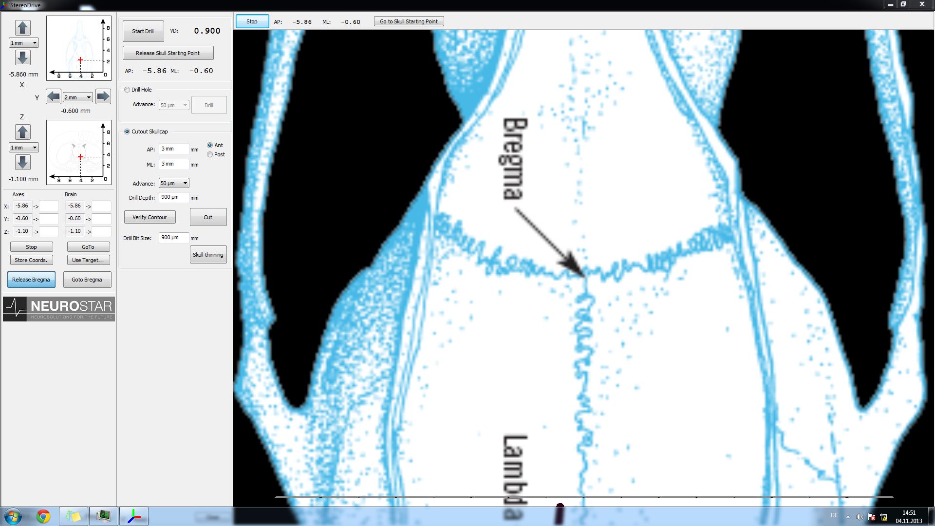 The Drill Robot is fully driven by the computer controlled Robot Stereotaxic system. The advancement steps of the drill (below 50µm) are computer controlled eliminating the human induced errors and deviations.Drill Autostop: The new Autostop Drilling functionality detects by electrical measurements when the skull is penetrated and stops all movements immediately (rotation of the drill bit and advancement in DV). This allows automatic drilling without damaging the underlying brain tissue.