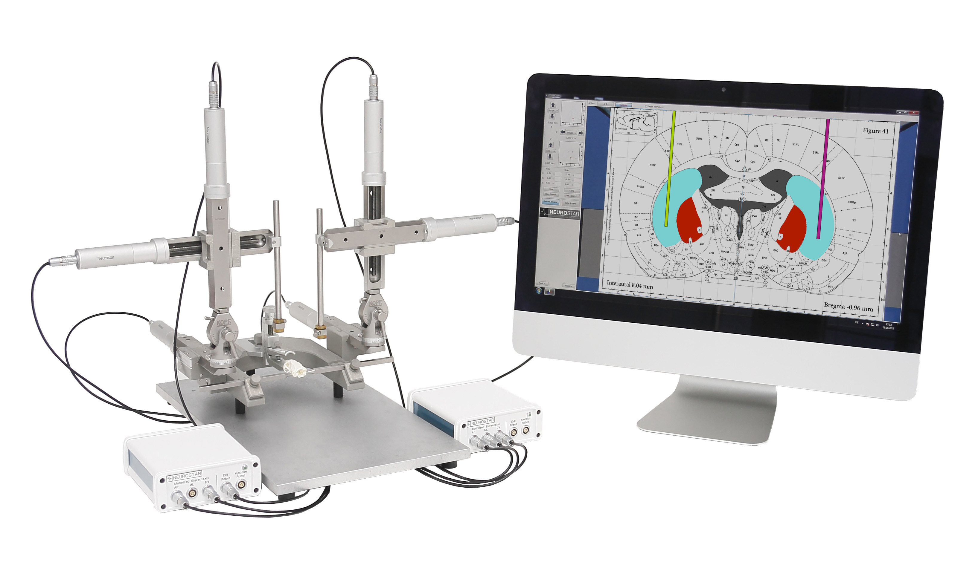 Neurostar is the inventor and only manufacturer of the Robot Stereotaxic system StereoDrive. Using the Robot Stereotaxic, you can focus on the experiment without having to manipulate the stereotaxic. It allows motorized, computer controlled positioning of the probe. Atlas integration and intuitive movement control enables high accuracy, high-throughput electrophysiology and stereotaxic injections.